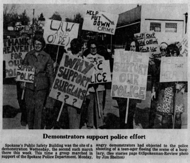 From 1975: A small number of demonstrators gathered at the Spokane County Courthouse to “show police we are behind them.”