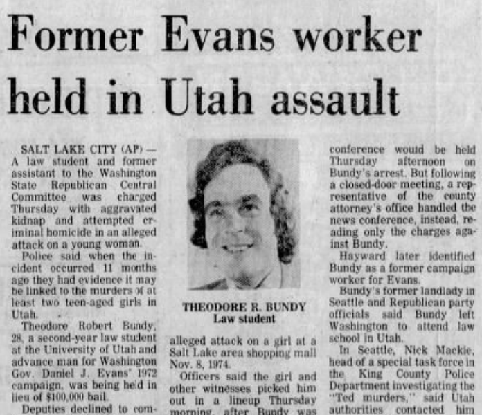 From 1975: A law student at the University of Utah and “former assistant to the Washington State Republican Central Committee{span}”{/span} was charged with aggravated kidnap and attempted criminal homicide following an attack on a girl at a Salt Lake-area shopping mall.