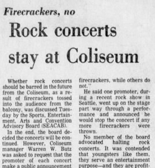 From 1975: Concertgoers had been throwing firecrackers into the Spokane Coliseum audience from the balcony, prompting a debate over whether rock concerts there should be banned.