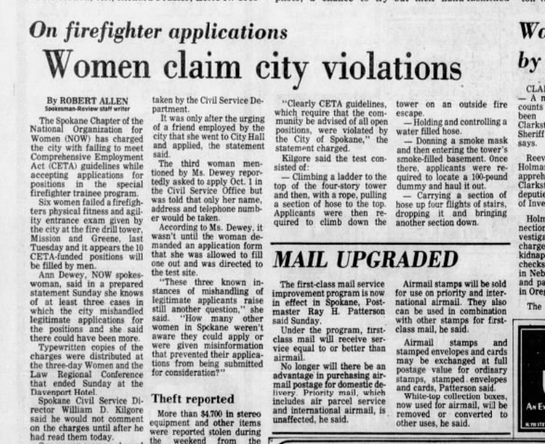 From 1975: The Spokane Chapter of the National Organization for Women charged the city of Spokane with failing to meet federal guidelines in accepting firefighter trainee applications.