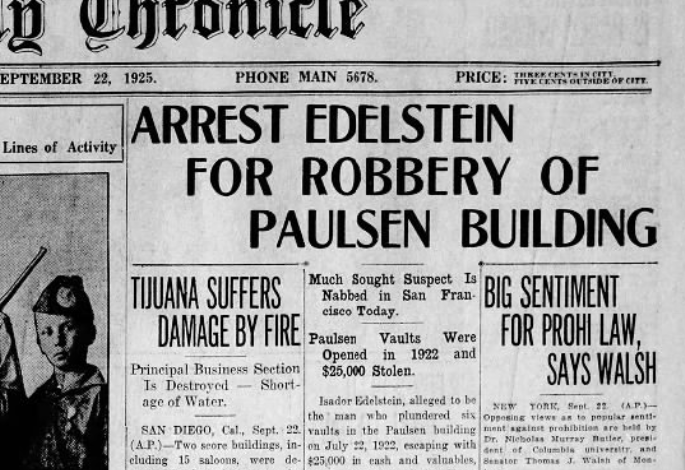 From 1925: Isador Edelstein, “master cracksman,” was arrested in San Francisco on charges of pulling off “one of the most sensational (burglaries) in Spokane’s history,” when he plundered multiple safes in Spokane’s Paulsen Building three years prior.