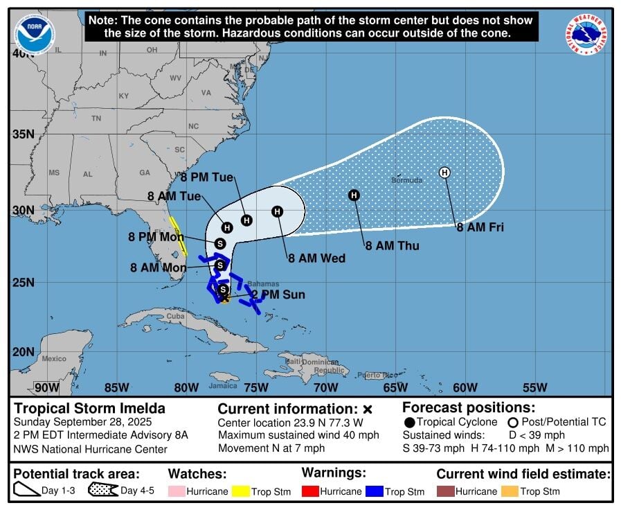 As of the NHC’s 2 p.m. advisory, the center of Imelda was located about 95 miles west-northwest of the central Bahamas and about 370 miles south east of Cape Canaveral. It is moving north at 7 mph with maximum sustained winds of 40 mph.