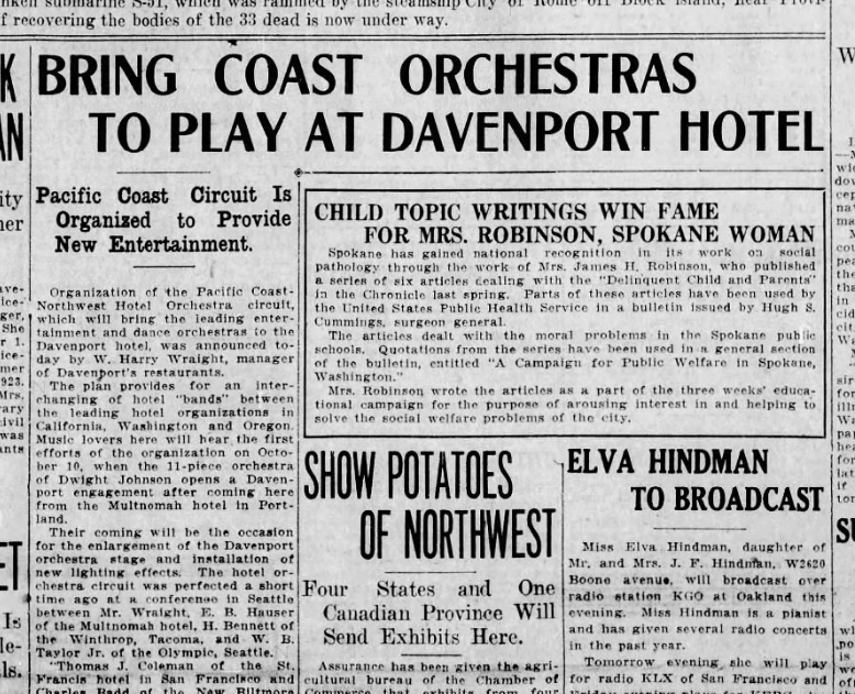 This day in history: Four fires west of Spokane suspected to be arson caused; Western states organize exhange program for leading hotel orchestras