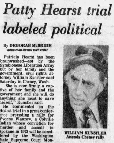 From 1976: Controversial civil rights attorney William Kunstler attended a rally on the Eastern Washington State College campus and labeled the sensational bank robbery trial of Patty Hearst as a political maneuver.