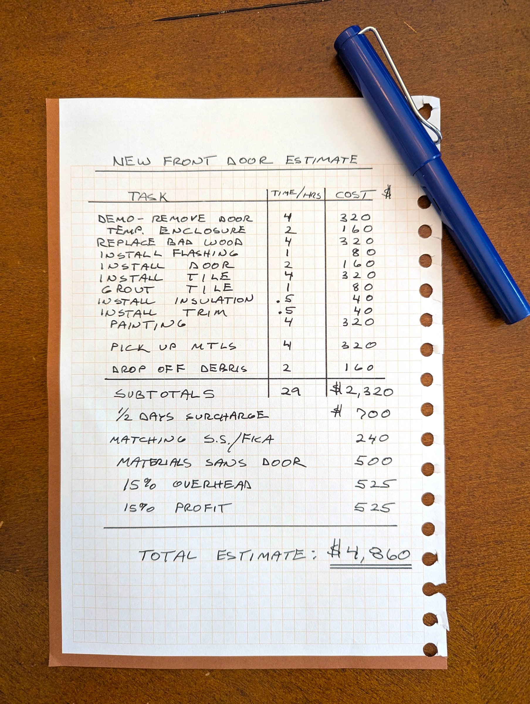 For Irene’s front-door job, each and every one of these tasks has to be accounted for: demolition; temporary weather enclosure, since the door must be taken out; replacement of the rotted wood; installation of the new wood floor; installation of the new flashing under the door; installation of the door; installation of the tile; grouting of the tile; installation of all the door trim; and painting/staining all the trim/walls.