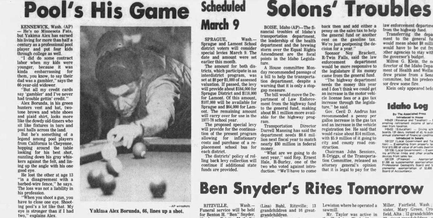 From 1976: Move over Minnesota Fats – Yakima Alex was making a good living as a professional pool player.