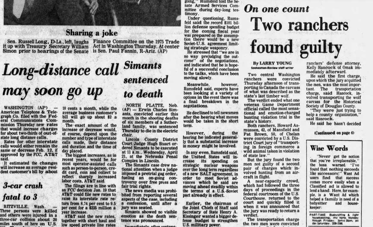 From 1976: Two ranchers were found guilty on one count in a wolf-shooting case in Spokane’s federal courtroom, but not guilty on a second, more serious, count.