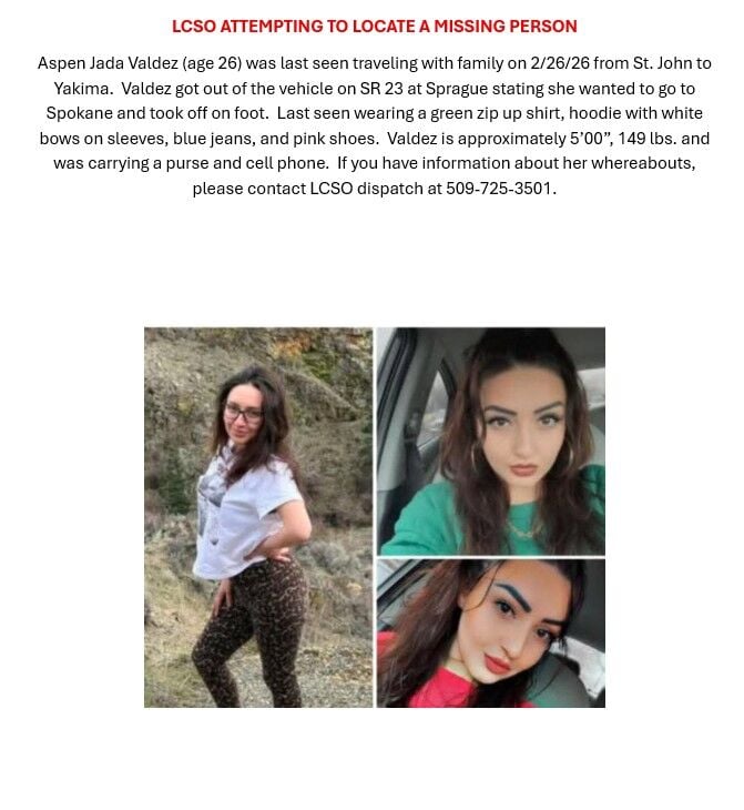 Anyone who has security footage or saw Valdez since Feb. 26 is asked to contact the sheriff’s office at (509) 725-3501.