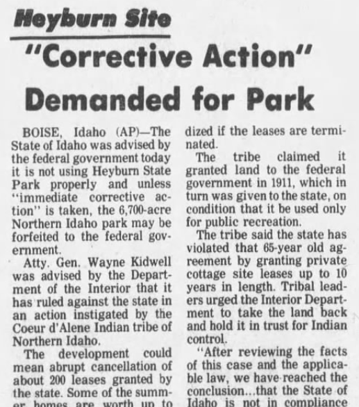 From 1976: Word arrived that the Coeur d’Alene Tribe had won its federal case against Heyburn State Park and that unless “immediate corrective action is taken,” the park “may be forfeited to the federal government.”