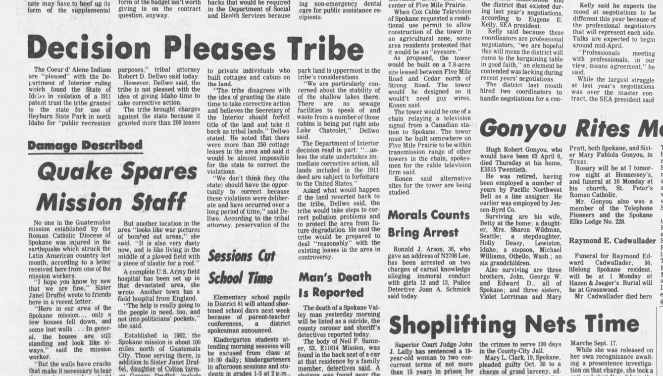 From 1976: The Coeur d’Alene Tribe was “pleased” – in part – with the Department of Interior’s ruling on the Heyburn State Park case.