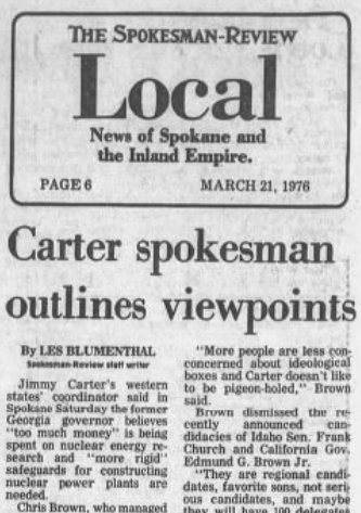 From 1976: The Western states’ campaign coordinator for Jimmy Carter who had emerged as a front-runner for the Democratic presidential nomination – arrived in Spokane to drum up support in the state.