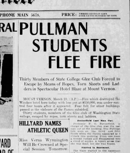 From 1926: About 30 members of the Washington State College Glee Club were on a trip to Mount Vernon, Washington, when they were forced to flee a hotel fire by means of “ropes, torn sheets and ladders.”